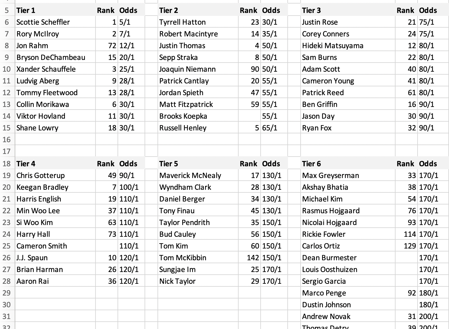 2025 British Open pool spreadsheet free download. Has several tabs for different types of pool options, including tiered picks or a raw list of the field to use for your British Open draft.