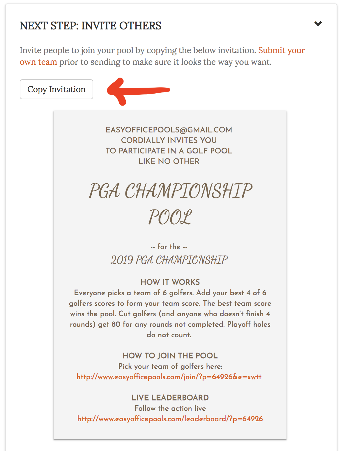 Yes! You did it, you created a PGA golf pool! Now as much as we’d like to break out the champagne and shower in our successes there’s one more important part of the process...Inviting people to join in the fun!