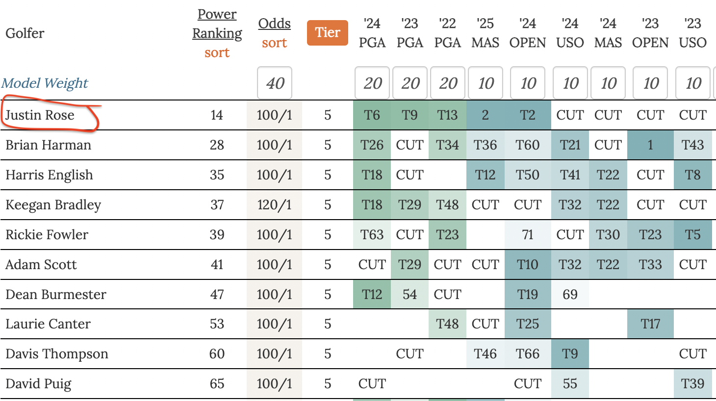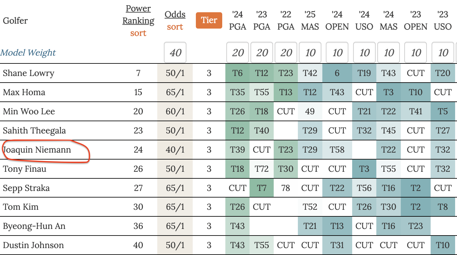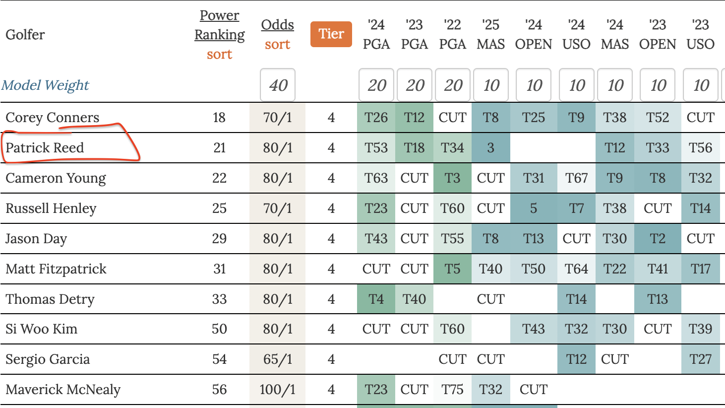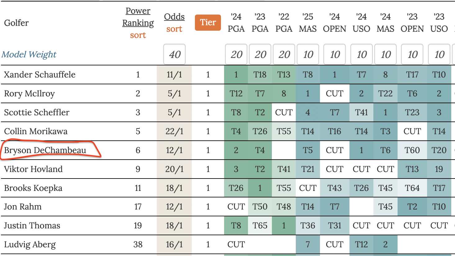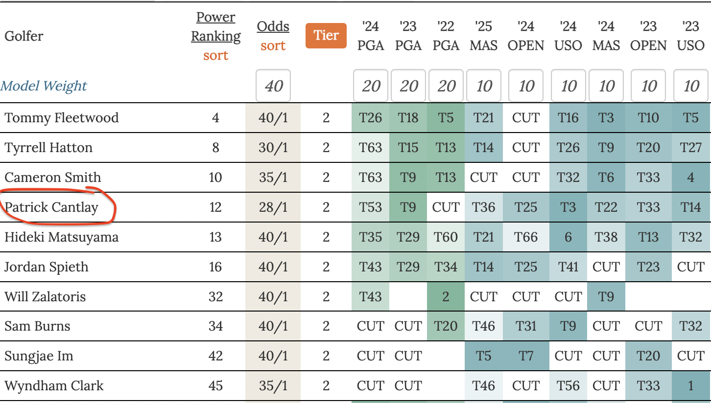 For the pick options in this article I show odds, tier, and power ranking considering recent PGA Championship (shown in Green) and recent Major finishes (shown in blue) only.