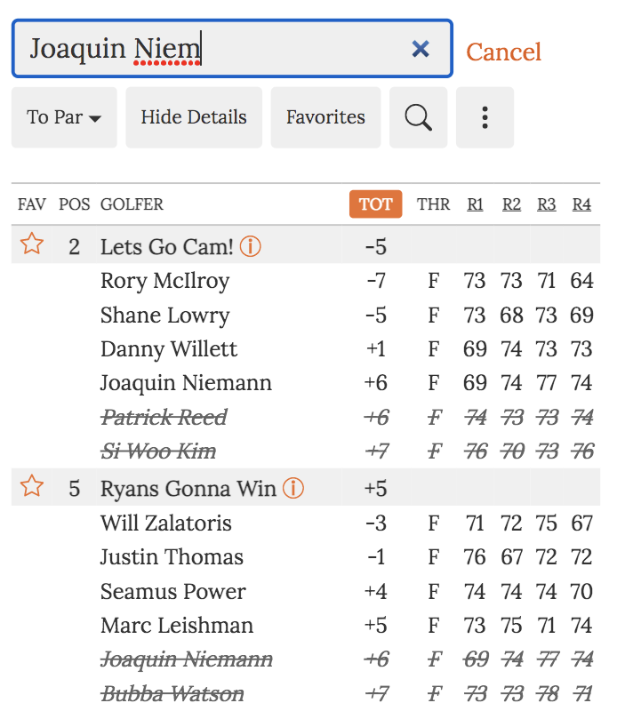 Search the leaderboard based on your team name, your real name, or golfers that were selected.